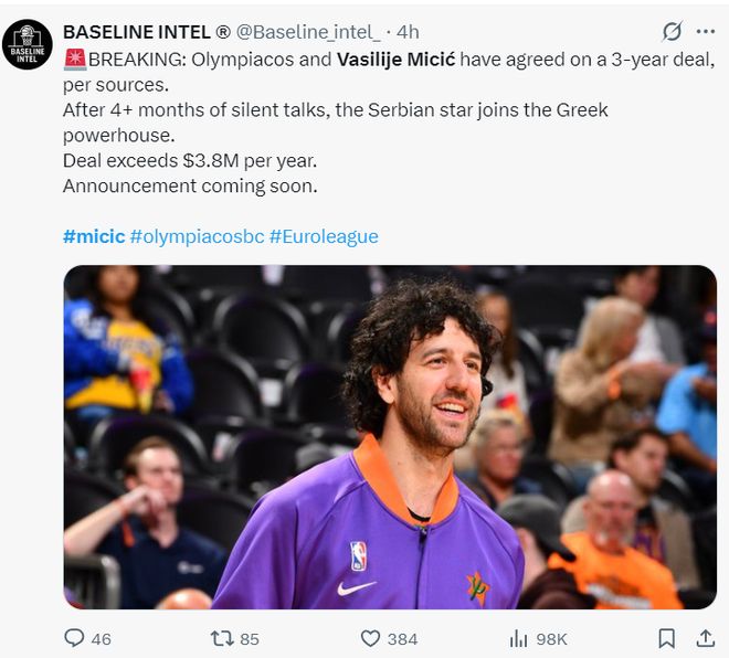 米契奇三年合同加盟奧林匹亞科斯!均薪超380萬(wàn) 買(mǎi)斷就花了610萬(wàn)