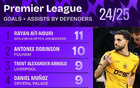 本賽季英超后衛(wèi)參與進球榜:艾特-努里11球位列第1、阿諾德第3