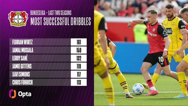 161次,維爾茨是近兩個(gè)賽季德甲成功過人次數(shù)最多的球員