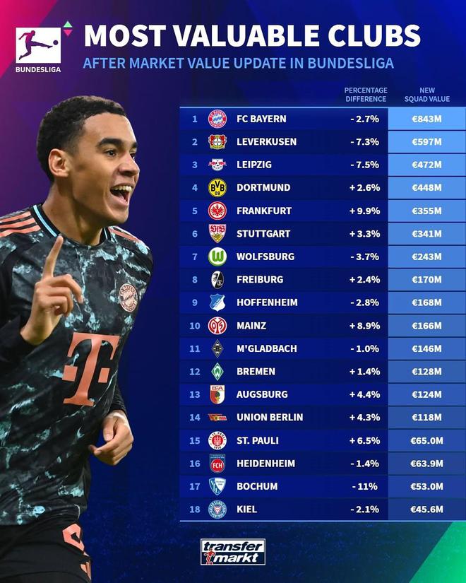 德轉(zhuǎn)更新德甲球隊總身價:拜仁8.43億歐居首,多特4.48億歐第四
