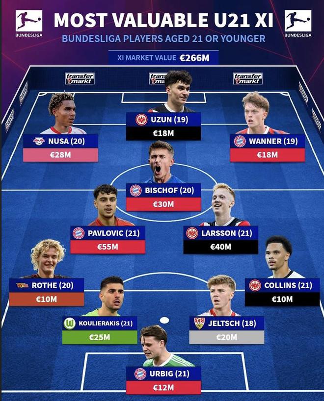 德轉(zhuǎn)列德甲U21最貴陣:帕夫洛維奇領(lǐng)銜拜仁4將,法鷹3人在列